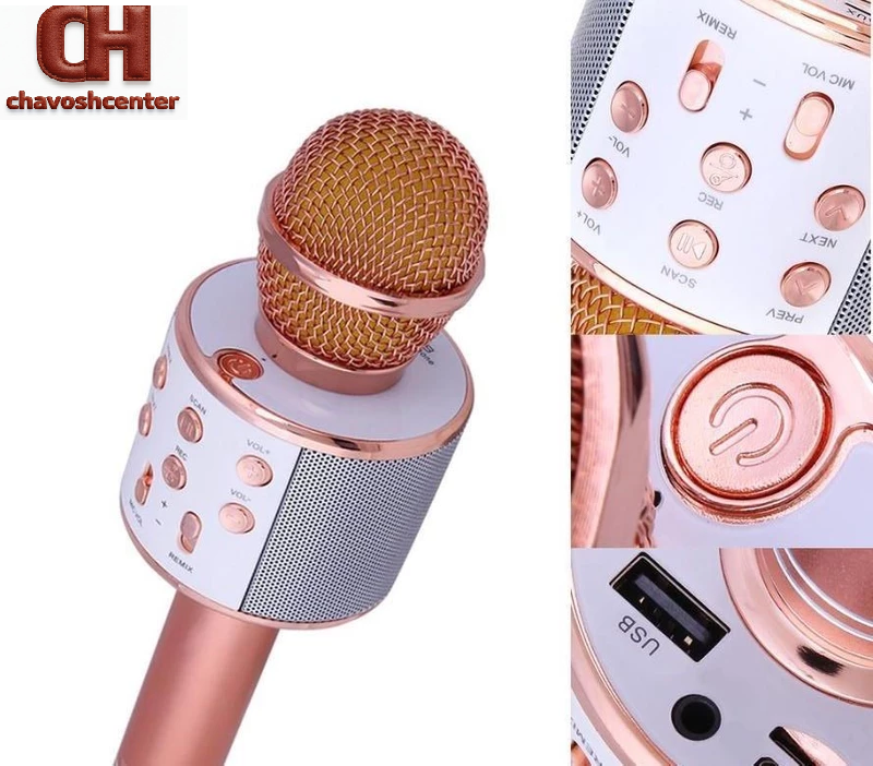 میکروفون اسپیکر مدل WS-858 یک میکروفون همه کاره با قابلیت اتصال بی سیم (بلوتوثی) و باسیم به تلفن های هوشمند اندروید و IOS ، انواع پلیرها و کامپیوتر می باشد. این دستگاه از جنس بهترین مواد ABS و آلومینیوم ساخته شده است . به طور خلاصه می توان امکانات این میکروفون را به این صورت نام برد: بلوتوث نسخه 3, ,ورودی حافظه فلش یا USB ، شیار مخصوص به کارت حافظه، دارای پورت AUX، باتری لیتیومی قابل شارژ ، رادیو، دکمه های تنظیم صدا، ضبط صدا، کارائوکه، 4 حالت تغییر صدا , اسپیکر های قدرتمند و ...
