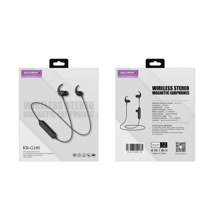 مشخصات فنی هندزفری بلوتوثی کلومن مدل KB-G190 مشخصات باتری دیگر ویژگیها میکروفون , کلید مدیریت میزان صدا , نگهدارنده گردنی , نگهدارنده گوشی رابط بلوتوث زمان موردنیاز برای شارژ هدفون 2 ساعت سایر مشخصات دارای اهنربا برای وصل شدن دو گوشی عمر باتری هدفون در حالت پخش موسیقی 4 ساعت عمر باتری هدفون در حالت مکالمه 5-6 ساعت مقاومت در برابر آب مناسب برای مکالمه , کاربری عمومی منبع تغذیه هدفون باتری نوع اتصال بیسیم نوع گوشی دو گوشی